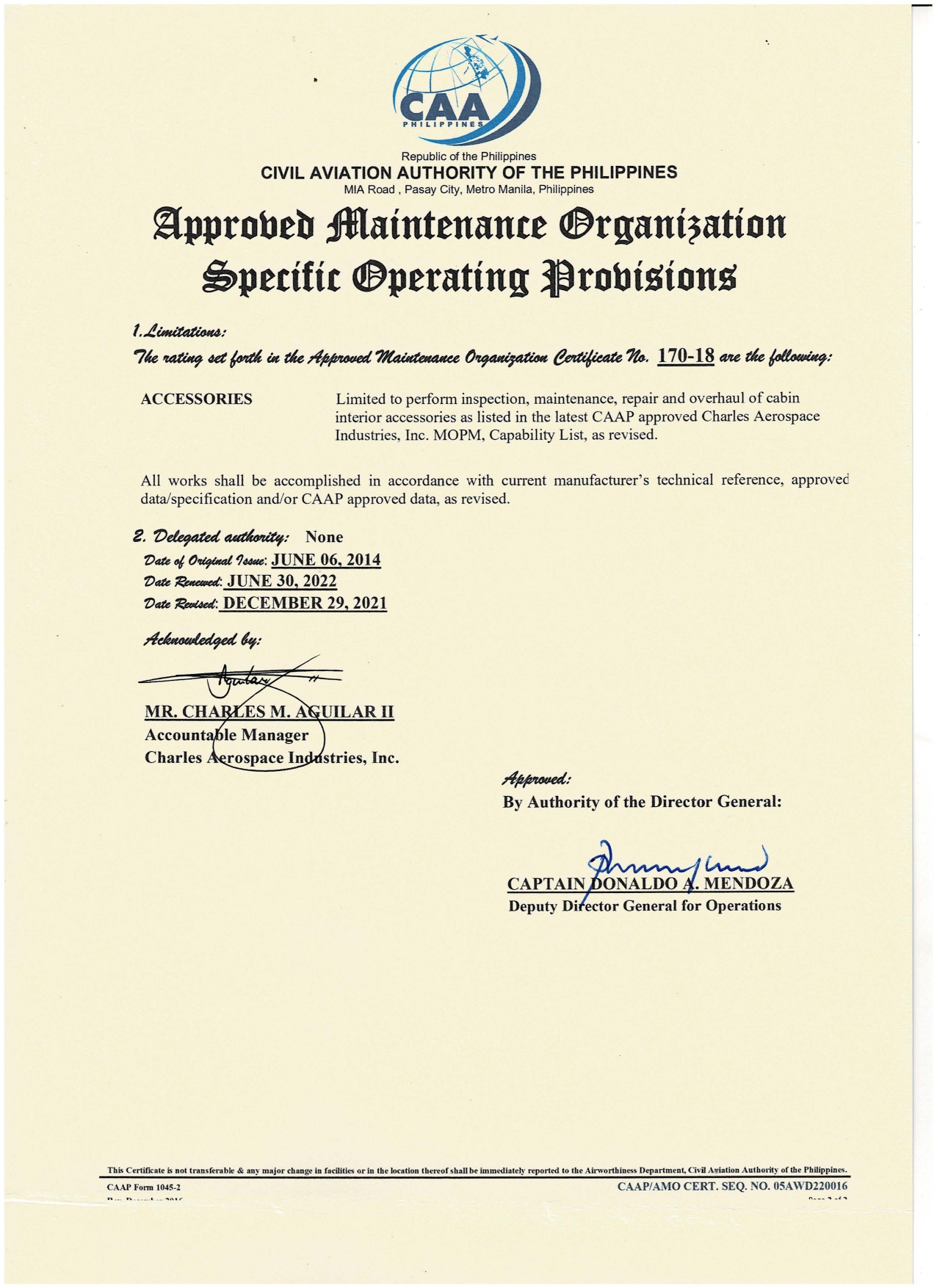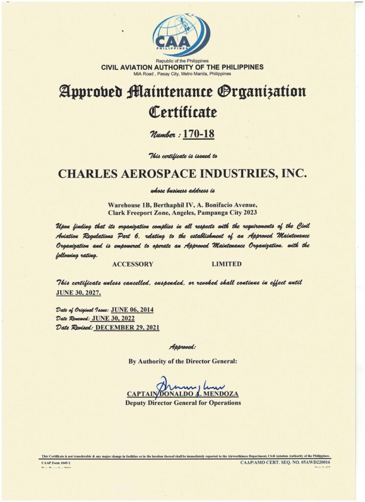 CAAP Approved Maintenance Organization (AMO) Certificate